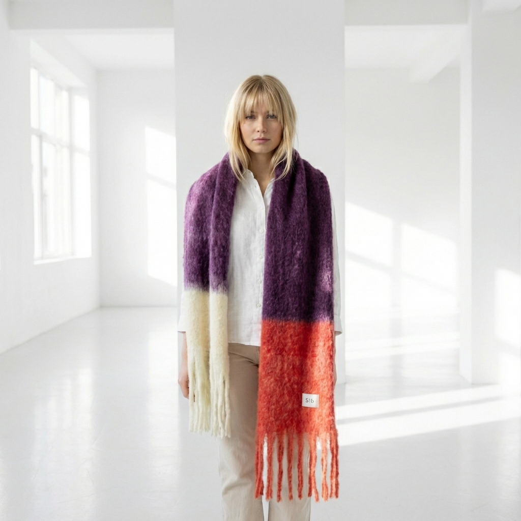 Etiquetas: Bufanda mohair, bunfanda Ezcaray, color block morada y roja